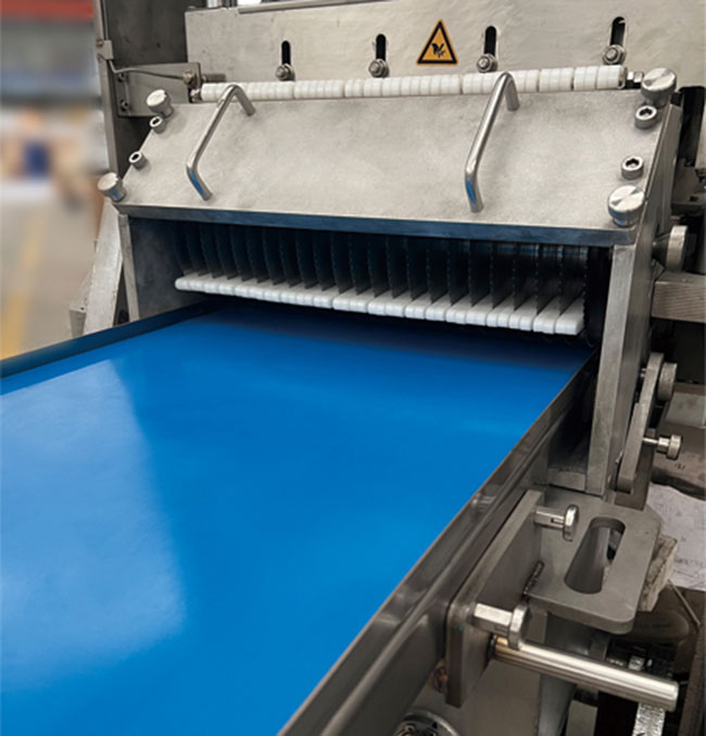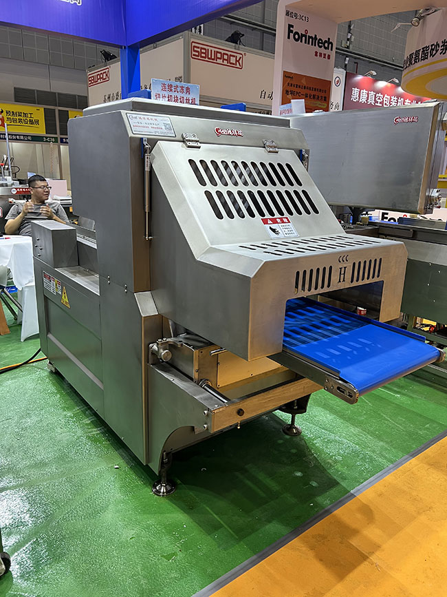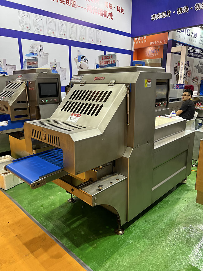 本產(chǎn)品在連續(xù)式切片機基礎上增加圓形刀組,組成二維切割形式,實現(xiàn)凍肉切丁切塊功能,連續(xù)式入料切割,流暢切割出成品肉丁肉塊,切塊切丁產(chǎn)量可達到2-3噸/小時。整套刀組均采用進口材質刀片,特殊齒形設計,使切割更加流暢,成型更加美觀。