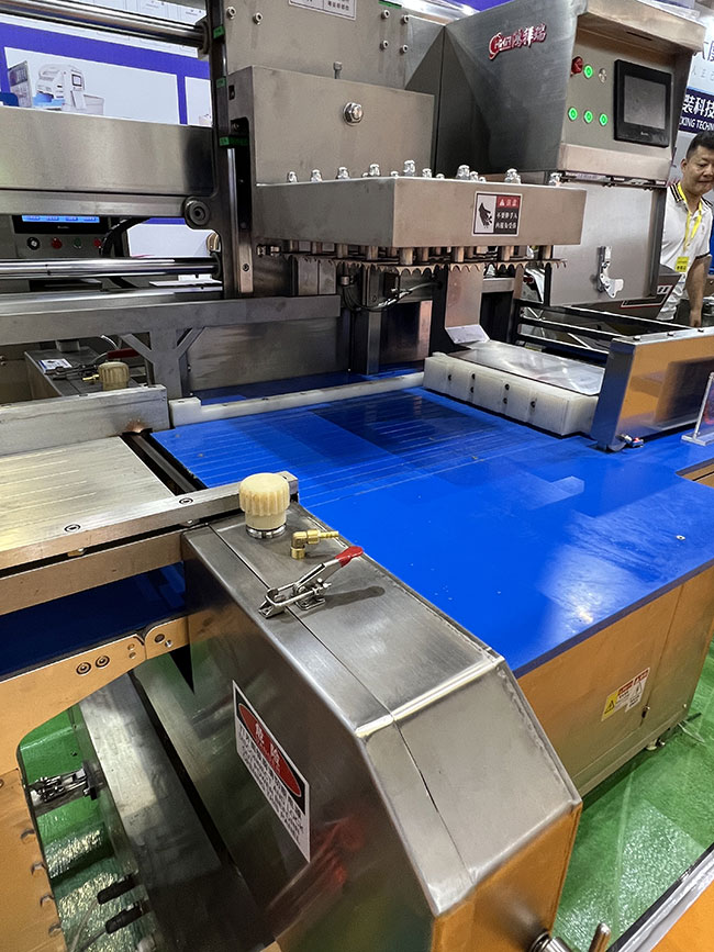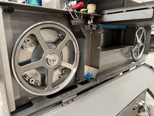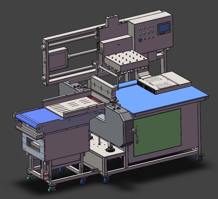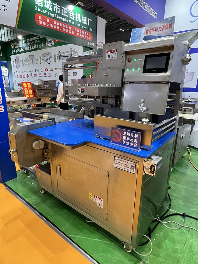 橫向平切式凍肉(骨)開(kāi)片機(jī),是我公司按照市場(chǎng)需求精心研發(fā)的一款骨肉類深加工切割設(shè)備。本設(shè)備已榮獲國(guó)家發(fā)明專利(專利號(hào):202310105353)。本設(shè)備采用鋸切的方式和橫向結(jié)構(gòu),可以將﹣20℃的凍肉、骨等食材鋸切成為均勻平直且最大橫截面的片,可以極大提高后續(xù)切塊、切絲、切片等工序的成品率和成型率。本設(shè)備采用氣電組合的動(dòng)力結(jié)構(gòu),整機(jī)設(shè)備由主機(jī)和氣動(dòng)升降夾料輸送帶組成,放入食材原料后無(wú)需人工干預(yù),氣動(dòng)壓料,自動(dòng)往復(fù)鋸切傳輸,極大提高了工作效率,保證了工作人員的安全性。開(kāi)片厚度可以根據(jù)用戶需求數(shù)控調(diào)節(jié),方便快捷。整機(jī)采用SUS304不銹鋼材質(zhì),工作完成后可用高壓水槍直接沖洗和消毒處理。本設(shè)備適合用于超低溫凍肉、骨類切割,例如:冷凍大塊部位牛肉、大塊部位豬肉、調(diào)理組合禽類、脊骨、扇子骨、冷凍鱈魚(yú)等硬質(zhì)食材的橫向開(kāi)片。外觀美觀大氣,是食品加工企業(yè)及食品深加工車間的優(yōu)秀選擇!